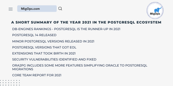 我们代表 PostgreSQL 社区和MigOps团队祝所有读者新年快乐 - 2022 年。PostgreSQL 是唯一一个每年都在不断增加采用率的开源数据库。2021 年是 PostgreSQL 世界的另一个里程碑。PostgreSQL 的每个用户都直接或间接地通过补丁提交或评论、特性请求、博客和文章、在 PostgreSQL 会议上发言、在postgres 邮件列表中讨论提议的特性,直接或间接地对 PostgreSQL 的采用产生了积极影响, 在本文中,我们将看到 PostgreSQL 生态系统中 2021 年的总结。
