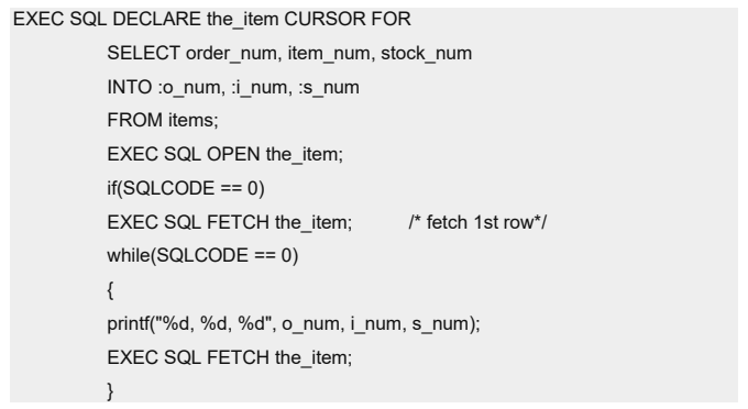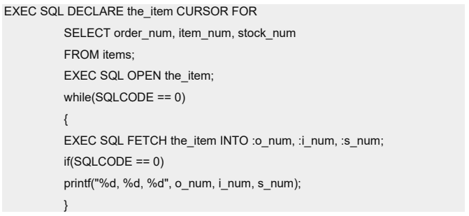 在此版本中,早已处理了无返回行的情况,因此,在循环中不存在第二次 SQLCODE 测试。