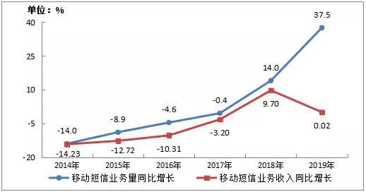 今年2月,工信部公布了2019年通信业统计公报。2019年,全国移动短信业务量比上年增长37.5%,增速较上年提高23.5个百分点;移动短信业务收入完成392亿元,与上年持平。