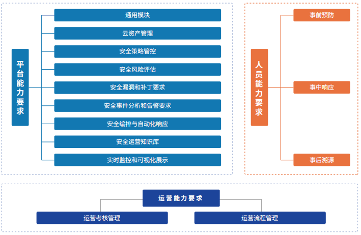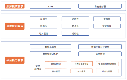 面向云计算的安全运营中心能力评估从平台能力、人员能力与运营能力三个维度进行审查,对安全运营中心进行评测,考察托管型SOC云安全服务提供方的安全运营中心产品性能,考察自建型与共建型SOC云安全服务使用方的安全运营中心建设与使用情况。