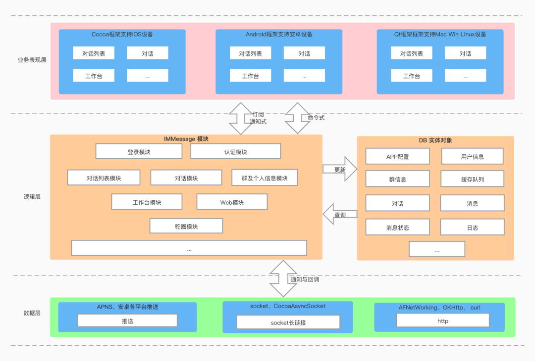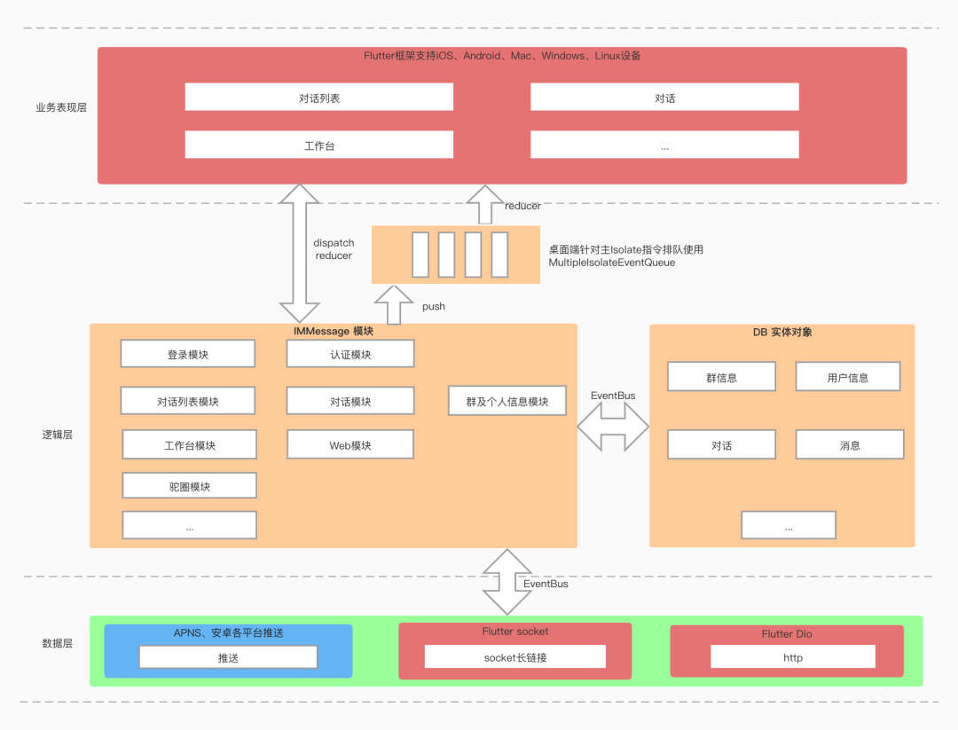 如图所示:数据层来源于推送或 http 或者长连接,处理完成后变成 Flutter 中的 IMMessage 类型对象,在各个模块中处理数据库存储与交互逻辑层将数据处理完毕之后可以使用订阅者模式分发到各个界面使用。