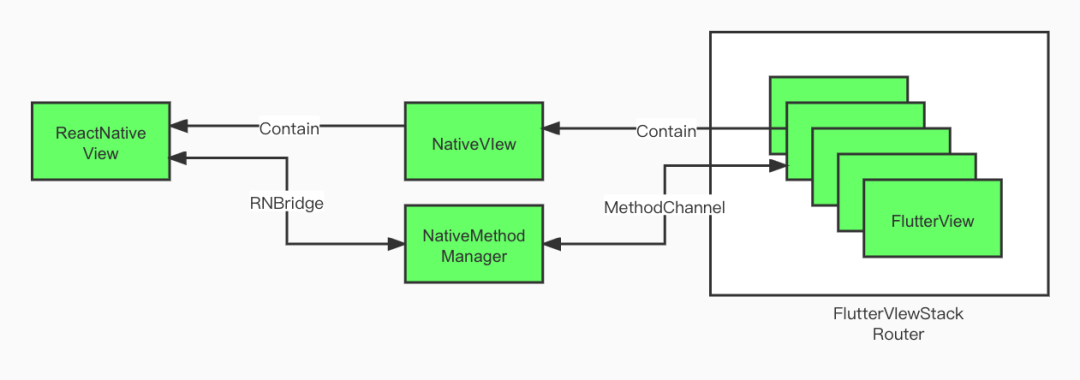 在 Flutter 端使用 Native 传递过来的 ReactNative页面 View 与 FlutterView 混合生成一个新的页面,这个页面可以接受 Flutter 栈的调用,与Flutter 其他页面互相传参与切换都与纯 Flutter 页面没有区别,这样在路由层面规避了各个端互相调用的适配问题。