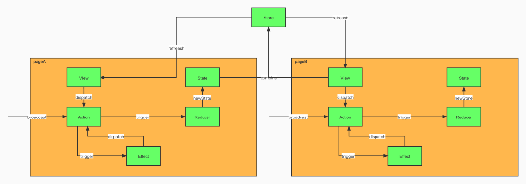 如图,我们在编写代码时只需要关心的每一个页面内部的单向数据流,对页面数据合并没有感知,而每个页面由 5 个文件组成:Action, Effect, Reducer, State, View,把使用各种方式对数据做处理与页面刷新分割开来,从工程层面和页面层面都维护了代码的秩序。