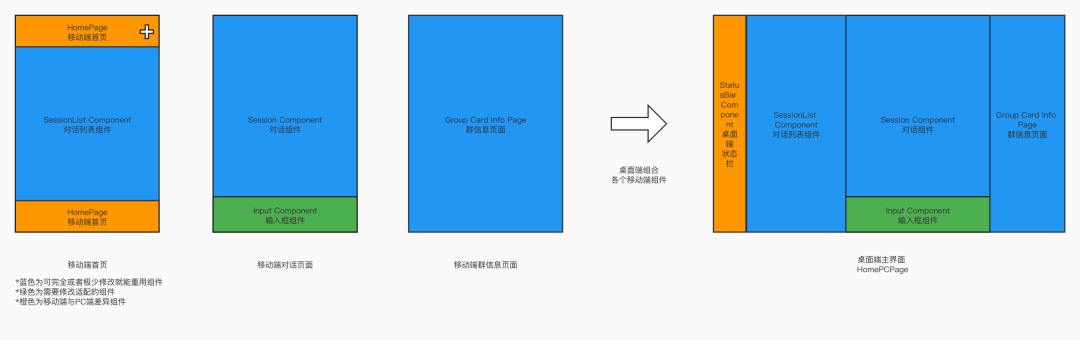 之前提到过我们的数据管理方案可以使各个页面解耦,page 作为一个整体可以被其他组件复用,桌面端就是利用这种设计模式,只需要给移动端各个page 增加 connector 就可以把移动端 view 集成为一个桌面端主页面,对应的逻辑层只需要根据桌面端的特性做一部分适配,例如调用API不同,桌面端支持右键行为等。