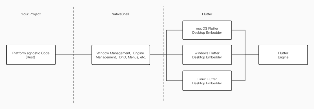 解决方案:引入 NativeShell 框架,采用多引擎方式解决 PC 端遇到的多窗口问题,改变工程结构,在 dart 启动 main 函数之前增加一个 rust 类来管理窗口,调用 rust 中的各平台系统库来把各种语言(c++ c# oc等)写成系统api统一成 rust 类型的文件,减少平台差异性。