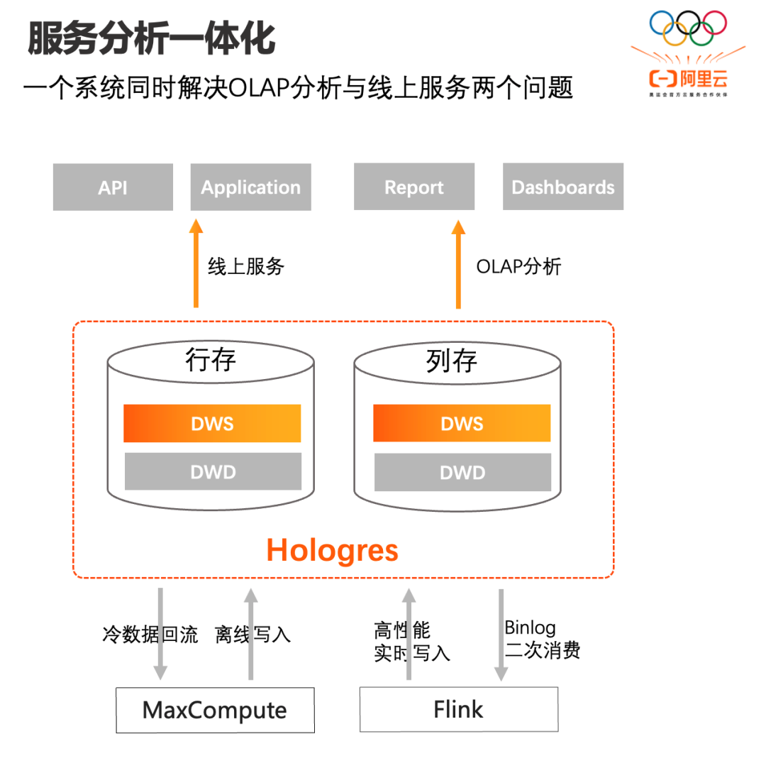 以阿里CCO的场景为例,数据写入到Hologres行存表后(行存表写入吞吐高,主键查询快,更新场景Binlog开销低),会通过Hologres表的binlog被Flink二次消费加工后,存入Hologres的列存表提供分析(列存对于统计类查询速度快)。行存表提供线上服务/点查,列存表提供分析能力。