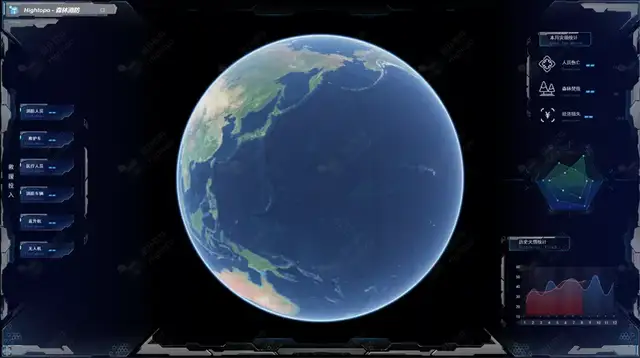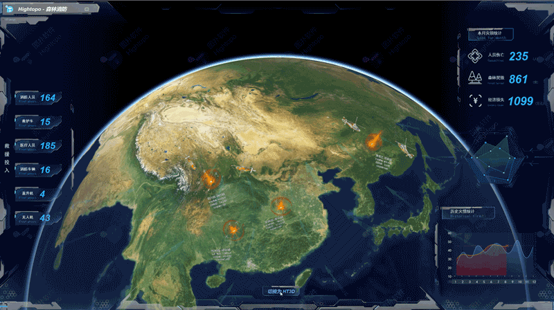 通过 Hightopo 自研引擎 HT 结合 GIS 呈现球面地图,对整个地球表层空间中的有关地理分布数据进行显示和描述,再利用无人机结合森林摄像机进行森林火灾监测。利用现代摄影测量技术进行火灾自动识别,实现对森林火灾信息进行全面、细致、准确地监测,可对森林火灾预警和扑救指挥工作提供实用的决策参考信息。