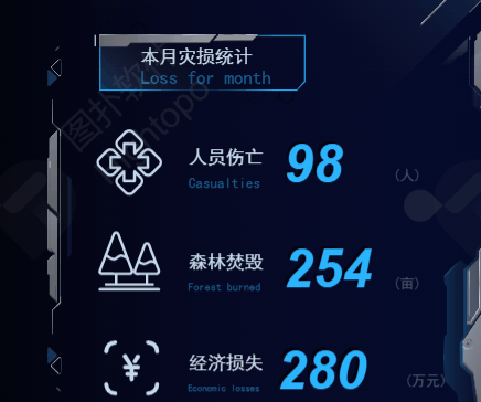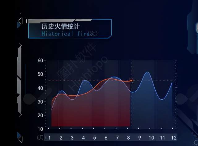 本月灾损和历史火情统计:可统计人员伤亡、森林焚毁、经济损失的详细数据,以便追溯。通过将 HT 可视化的 2D 面板和图表的数据绑定,采用面积图的展示方式统计每个月的火灾情况。通过历史数据,确定森林火灾的多发区域和时间。