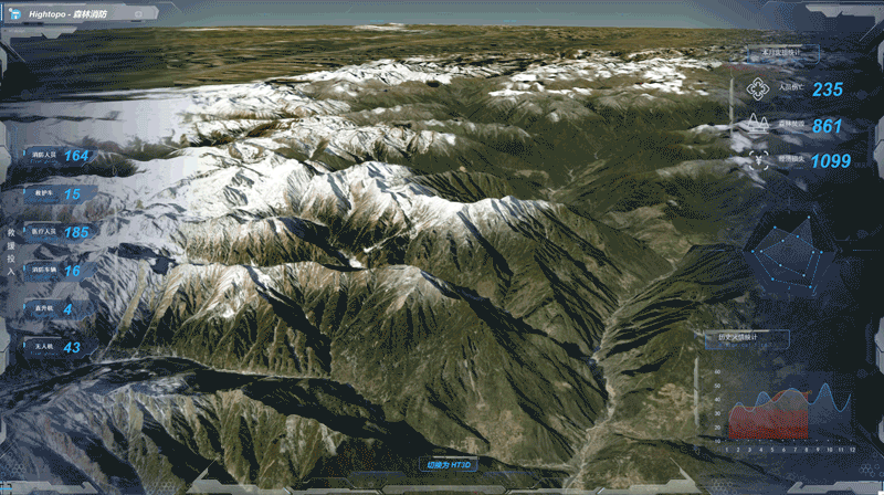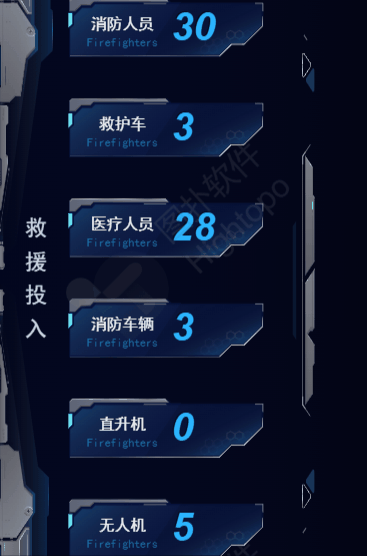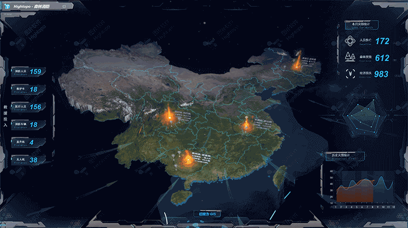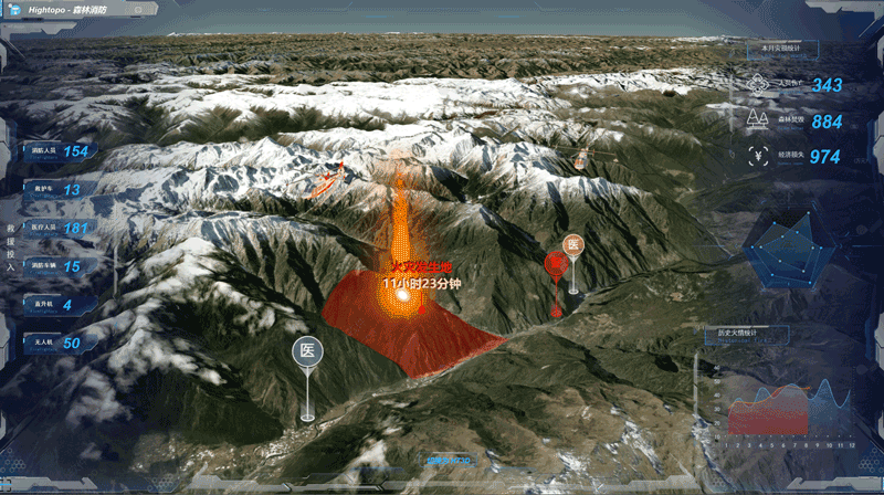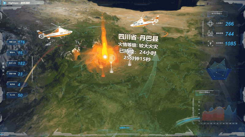 Hightopo 可视化大屏能有效统计消防人员、救护车、医疗人员、消防车辆、直升机、无人机的数据并进行展示,方便管理者对人员和设备进行调配。选用直升机、小型固定翼、无人机等相关设备进行防火、灭火工作能够在时间和效率上起到很大作用。
