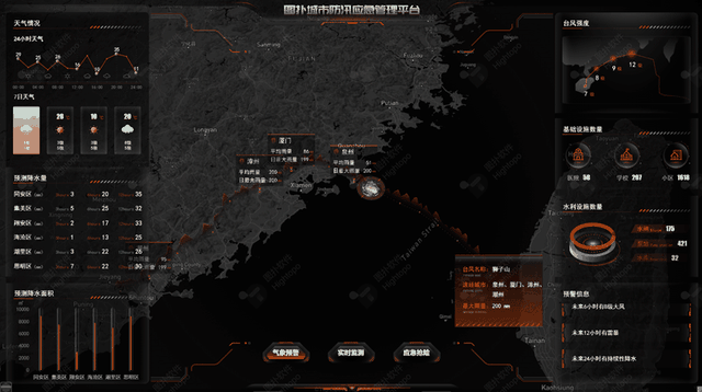 运用 Hightopo 自主研发产品 HT for Web,结合 GIS,实现防汛救灾工作的及时安排,及时布置,及时抢险,及时救援。在 GIS 系统中对海量的 POI 数据、交通流量数据、规划数据,现状数据等进行多样化的可视化展示。根据收集的降雨量信息,推演洪水的到达时间,对小区百姓和水库工作人员等做好提醒。