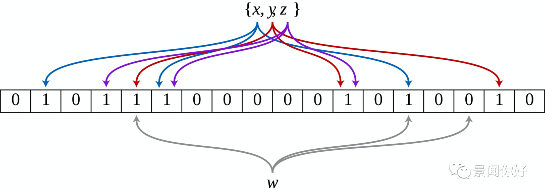 An example of a Bloom filter, representing the set {x, y, z} . The colored arrows show the positions in the bit array that each set element is mapped to. The element w is not in the set {x, y, z} , because it hashes to one bit-array position containing 0. For this figure, m = 18 and k = 3.