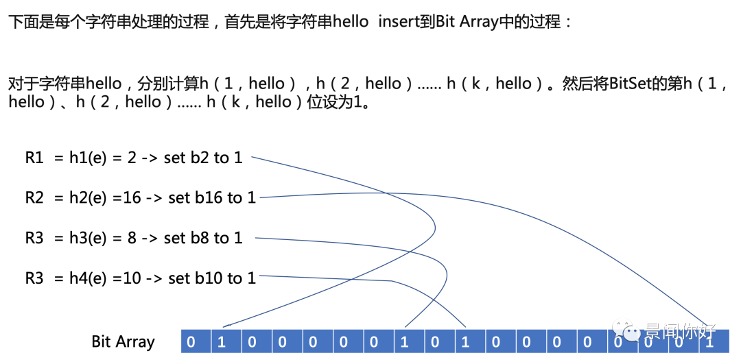 An empty Bloom filter 是由一个bitArray(长度m)和一个hash函数集(个数k)组成,bitArray初始化为0,m远大于k. 每一个hash函数都将元素映射为0~m-1之间的一个整数。举个例子