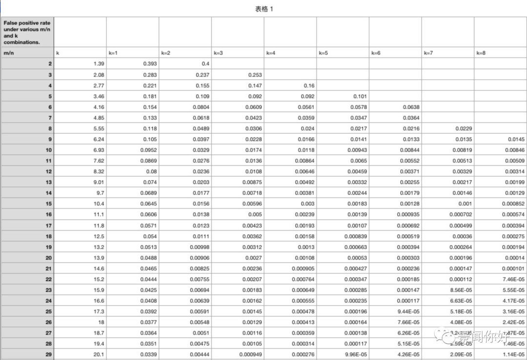 从上面给出的这个表格中,m:BitArray的位数,n:插入字符串个数,k :hash函数个数,从中可以看到 m/n越大准确率越高,误判率越低,k越大准确率越高,误判率越低。但实际上根据公式推导还不完全是这样的情况。