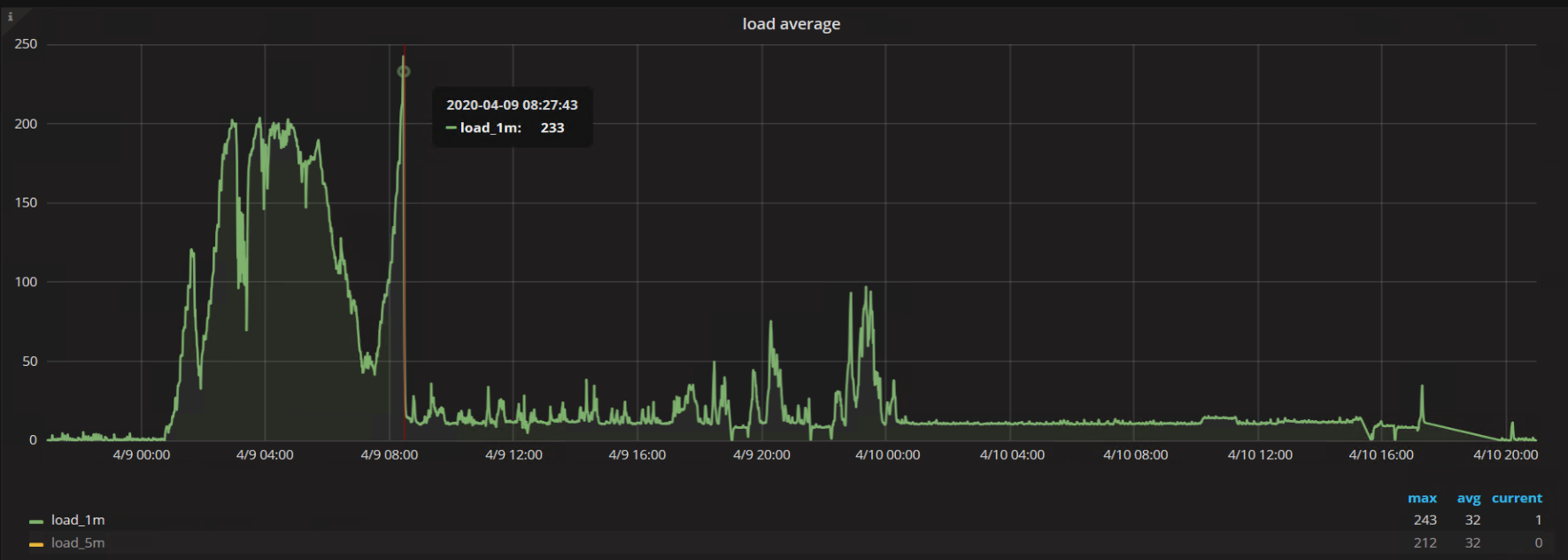 值得一提的是,其实还有一台备份服务器,和这台算是难兄难弟,他的负载也非常高,我目测按照这种情况,应该很难撑过今天,所以也是在下班前和同事进行了讨论,对服务做了降级处理。也就意味着,我不用太担心整个周末的质量了,不用大半夜被报警惊醒了。