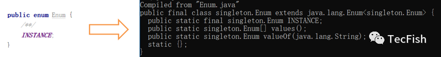 这是在cmd中编译的枚举类,可以看到,枚举本质上是通过普通的类来实现的,只是编译器为我们进行了处理。每个枚举类型都继承自java.lang.Enum,而每个枚举常量是一个静态常量字段,这样保证了每个枚举类型及枚举常量都是不可变的。可以利用枚举的这两个特性来实现线程安全的单例。如下: