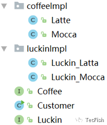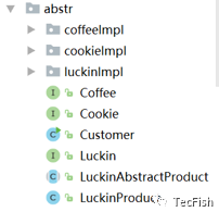 其中coffeeImpl、cookieImpl、luckinImpl分别为各种咖啡、饼干和下属的各个瑞幸分部。LuckinAbstractProduct代码如下: