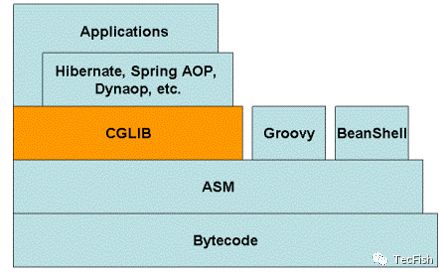 CGLIB底层使用了ASM(一个短小精悍的字节码操作框架)来操作字节码生成新的类。除了CGLIB库外,脚本语言(如Groovy何BeanShell)也使用ASM生成字节码。ASM使用类似SAX的解析器来实现高性能。如下图: