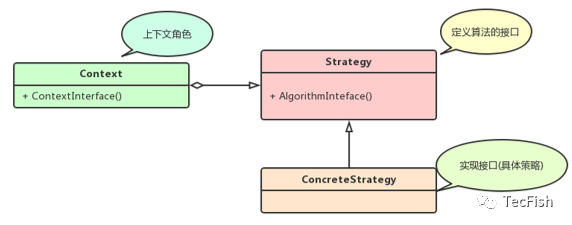 策略模式使用的就是面向对象的继承和多态机制,从而实现同一行为在不同场景下具备不同实现。它有三个角色: