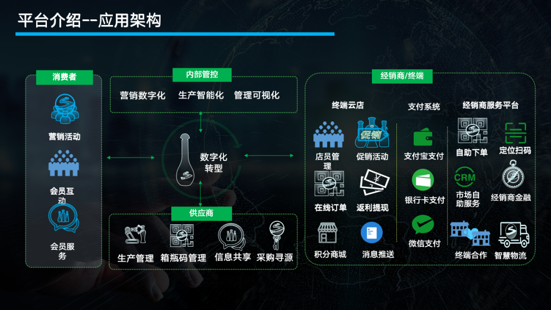 第一类是针对消费者,分为营销活动、会员互动、会员服务。第二类是内部管控,即营销数字化、生产智能化、管理可视化,对外又分为供应商、经销商/终端。经销商/终端,则提供店员管理、促销活动、返现/提现、在线订单、积分商城、消息推送,以及一些自动服务等,例如消息推送就是洋河结合青云 API 接口和微信云门店自主开发的。