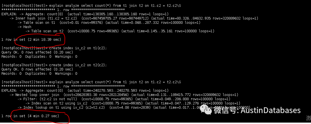 从图中可以清晰的看到查询已经走了hash join,那老的MYSQL DBA 可能会提出一个问题,到底这个hash join 比 nest loop 能好多少,可别和MYSQL 8 VS MYSQL 5.7一样,谁快还不一定。下面做了一个对比,可以清晰的看到在某些情况下,HASH JOIN 在没有索引的情况下,比添加了索引的NEST LOOP 的速度要快了一倍。