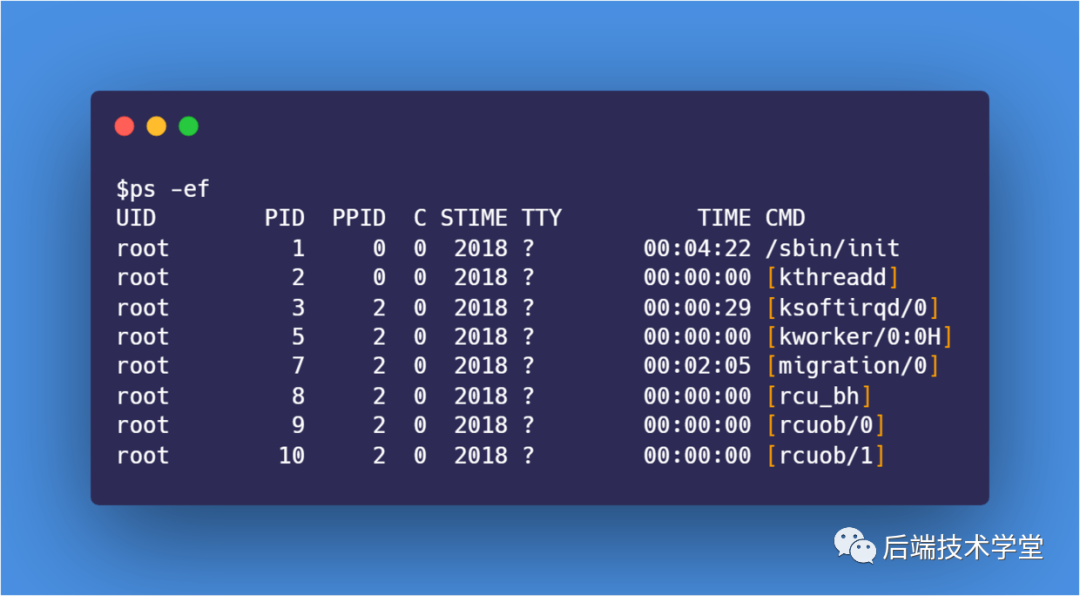 ps -ef|grep intresting第一列PID代表进程号,PPID(parent process ID)代表父进程号。