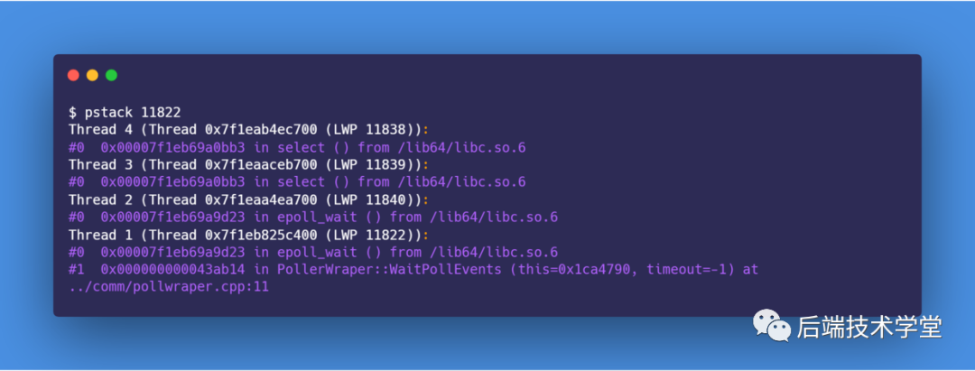 pstack pid你能看到当前线程运行中的堆栈信息,其中的pid可用之前的
