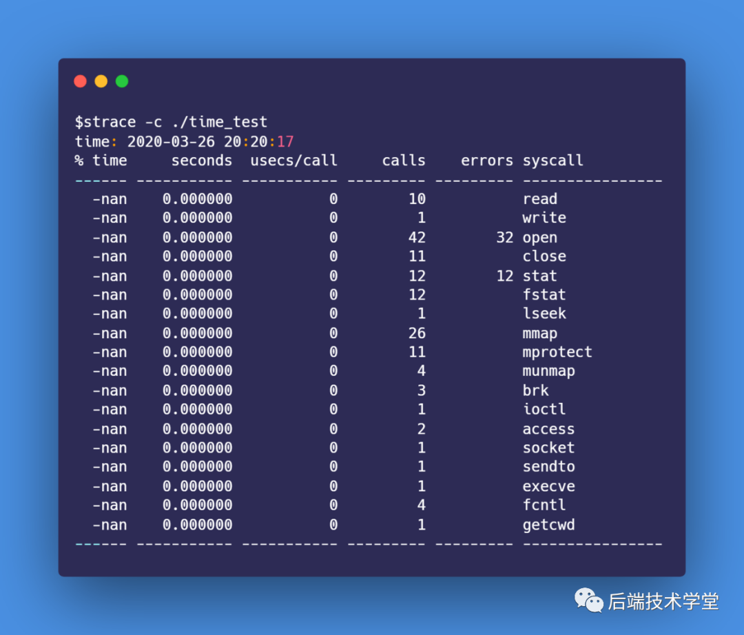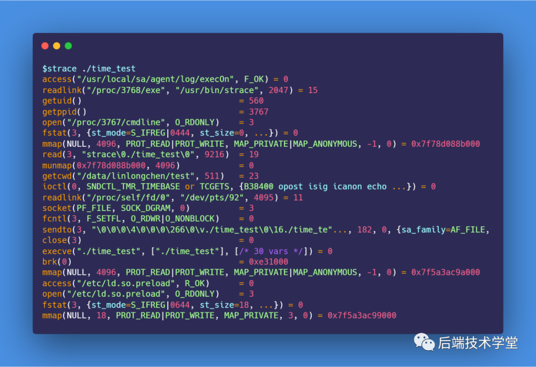 strace后面跟着启动一个进程,可以跟踪启动后进程的系统调用和信号,这个命令可以看到进程执行时候都调用了哪些系统调用,通过指定不同的选项可以输出系统调用发生的时间,精度可以精确到微秒,甚至还可以统计分析系统「调用的耗时」