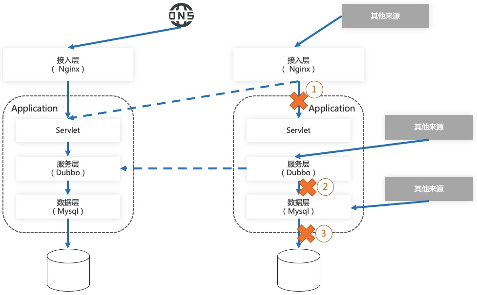 - 服务层。业务流量在机房内部和跨机房的同步调用方式,一般有 Consumer、Provider、注册中心等角色,具备流量路由、流量保护、故障隔离三个核心能力,避免调用错误导致的数据脏写,加速切流期间的业务恢复。