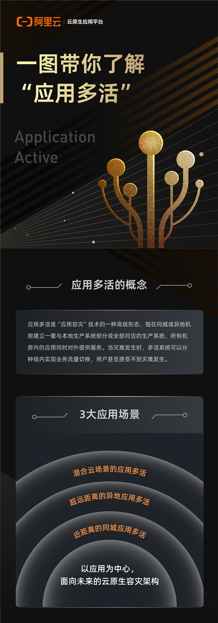 “业务大规模扩展机房资源不可用怎么办?机房挂了怎么办?业务突然奔溃怎么办?台风地震导致断电怎么办?”2013 年,当时淘宝完成去 O 没多久,双十一的规模较上年进一步飞增。阿里的工程师正面临着上述的这一系列问题,一方面是机房资源非常紧张,容量不足,另一方面是杭州出现罕见的高温天气,机房面临断电的风险。异地多活架构在这个背景下孵化出来,它的载体是集团版本的 UnitRouter&UnitBrain 。随着淘宝的业务规模演进,异地多活也从近距离同城双机房到远距离异地双活,再到三地四单元、多地多活,沉淀了丰富的机房级应用多活经验。2019 年,阿里巴巴系统全面上云,异地多活架构也跟着上云的节奏孵化出阿里云云产品 AHAS-MSHA,服务集团和云上客户。2022 年 1 月 11 日,AHAS-MSHA 代码正式开源,命名为 AppActive 。AppActive 是一个面向业务应用构建云原生高可用多活容灾架构的开源中间件,它的主要价值:- 分钟级 RTO。恢复时间快,阿里内部生产级别恢复时间平均在 30s 以内,外部客户生产系统恢复时间平均在 1 分钟。