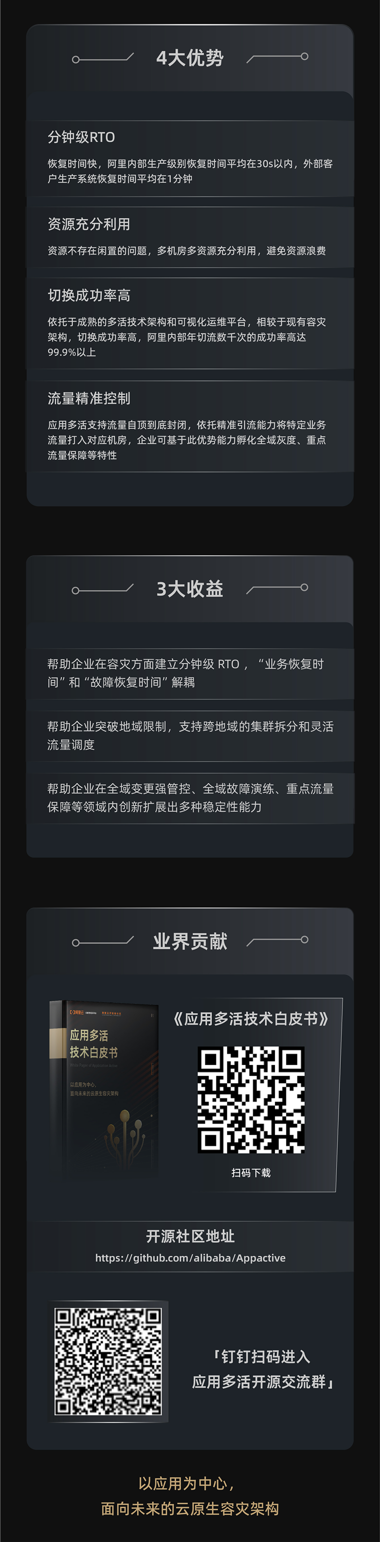 “异地多活”和“单元化”源于阿里,也受到了业界的认可。阿里也一直希望应用多活的产品生态可以做到标准和开放,对业界做出贡献。基于应用多活的标准技术,业务应用在不同的云厂商之间,不同的基础设施之间,不同的芯片之间都可以实现互通互联。业务应用在资源充分利用的同时,达到分钟级甚至秒级的 RTO 指标,真正意义的做到不惧故障。今天,AppActive 开源的第一个版本只是应用多活领域的一个起点,欢迎大家参与进来一起共建应用多活生态。想要了解更多 AppActive,钉钉搜索群号:34222602,加入 AppActive 开源讨论群参与讨论吧!