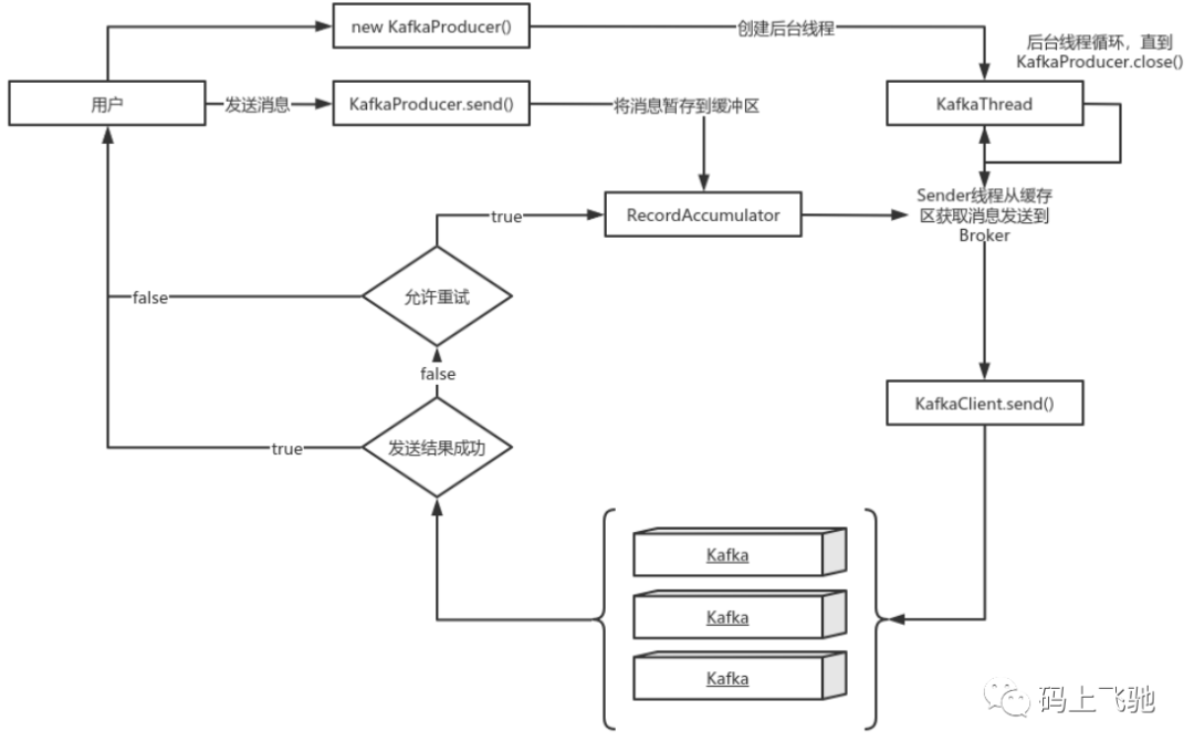 5:如果发送失败,那么判断是否允许重试。如果不允许重试,那么返回失败的结果;如果允许重试,把消息再保存到RecordAccumulator中,等待后台线程KafkaThread扫描再次发送。