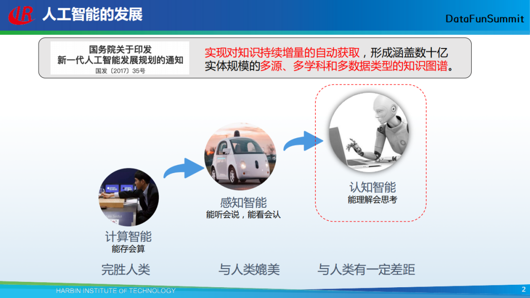 首先给大家介绍一下人工智能发展的历程,其主要可归结为3个重要的阶段:第一个阶段是计算智能,第二个阶段是感知智能,第三个阶段是认知智能。在前两个阶段,计算机能够做的像人类一样,甚至比人类做的更好。在第三个阶段,计算机还远远达不到人类的水平。很多研究者们发现,通过知识的使用,可以有效地提升计算机的认知水平。在国务院2017年印发的“新一代人工智能发展规划的通知”中,明确提出:实现对知识持续增量的自动获取,形成涵盖数十亿实体规模的多源、多学科和多数据类型的知识图谱。同时,知识图谱也是实现机器认知智能的基石。