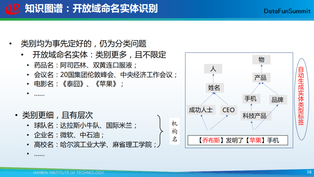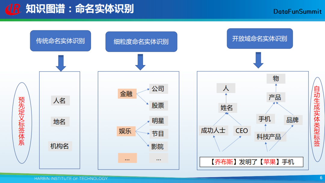命名实体识别主要可分为传统命名实体识别、细粒度命名实体识别与开放域命名实体识别三类。第一类指的是从输入的文本中将人名、地名、机构名识别出来。传统的命名实体识别方法只能识别出有限的实体,在很多任务上的效果都不理想,然后就出现了第二类命名实体识别。简单而言,这类识别主要是在不同的领域下识别专有的命名实体。这两类命名实体识别方法需要预先定义实体的类别标签。与上述两类方法对应的是开放域命名实体识别,即从文本自动挖掘实体的细粒度类别标签。在上图的例子中,假设已从“乔布斯发明了苹果手机”这个句子中识别出“乔布斯”和“苹果”是两个命名实体,接下来要做的,就是针对这两个实体,找到它们的细粒度类别标签。通过开放域命名实体识别方法,可以自动生成实体的类别标签。