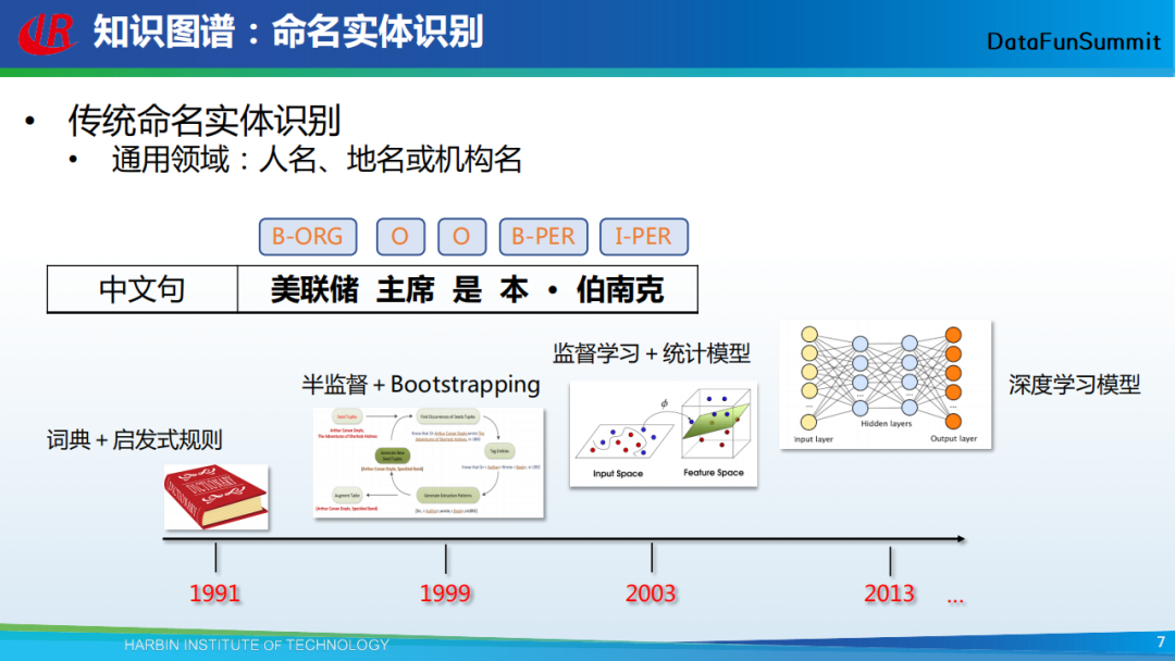 首先从传统的命名实体识别讲起。传统的命名实体识别就是从输入文本中去识别出人名、地名、机构名,在上图示例中,输入的中文句子为:“美联储主席是本•伯南克”,从中可识别出:“美联储”是一个机构,“本•伯南克”是一个人名。对于命名实体识别的研究已经持续了很长一段时间,最早可追溯至1991年,彼时提出可利用词典+启发式规则进行命名实体识别,低召回率是这类方法面临的最大问题;接下来,有研究者提出可以使用半监督+bootstrapping的方法来做,识别更多的实体以获得更多的数据;当数据充分后,在2003年提出了通过统计模型来做命名实体识别;到2013年以后,在该领域主要采用深度学习的模型来做,并且取得了令人兴奋的效果。