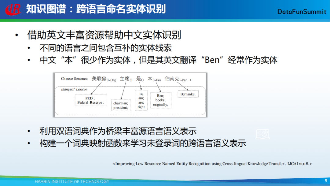 很多研究者对上述讲述的模型进行了扩展,并且将它们用在了不同的任务或领域上。这里给大家分享一个我们做的工作,即跨语言的命名实体识别(请见《Improving Low Resource Named Entity Recognition using Cross-lingual Knowledge Transfer. IJCAI 2018》)。该工作的主要思路是,借助于英文丰富的资源来帮助中文实体识别。由于不同语言之间包含互补的实体线索,在上图示例中,中文中的“本”很少作为实体,但是其英文翻译“Ben”却经常作为实体。因此,我们可以利用双语词典作为桥梁丰富源语言的语义表示,构建一个词典映射函数来学习未登录词的跨语言语义表示。
