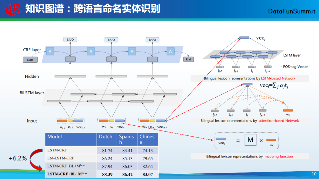 该图为上述模型的整体架构,我们可以看到,这个模型依然采用了双向LSTM(BiLSTM) +CRF的架构。不同的是输入层的词语表示,其中最左边的橙色表示词语在当前语言下的嵌入表示(即通常所用的词嵌入),中间的黄色为词语的位置向量,最右边的蓝色表示词语的跨语言表示。那么如何获得词语的跨语言表示呢?我们可以通过跨语言词典获得词语的跨语言翻译。再者,通过跨语言词典将当前词语翻译为特定语言的向量时,往往会有多个结果,但只有1-2个结果与当前的上下文是一致的。因此,我们可利用注意力机制来学习词语在当前语境下的、最合适的翻译向量。当然,还有一种情况,即对于跨语言词典无法翻译的词语,这时我们会去学一个映射矩阵,进而将词语从源语言映射到目标语言。通过以上三种表示,我们可以获得词语的跨语言表示。实验结果表明,相较于其它基线方法,我们的模型在多种语言上获得了性能的提升。