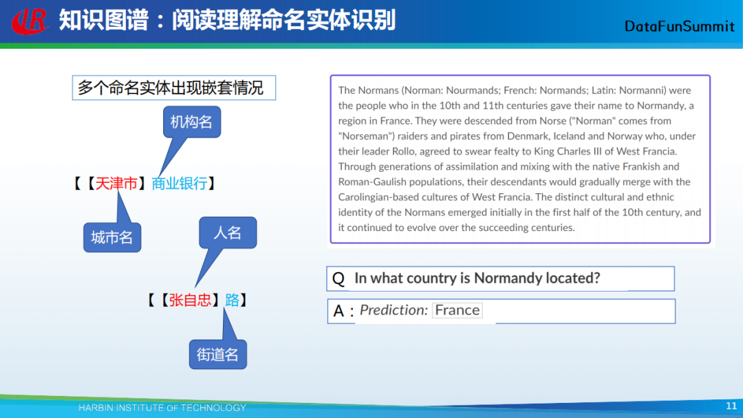 如上图示例(左),这两个例子中都包括一个短实体和一个长实体。在第一个例子中,“天津市”是一个城市,“天津市商业银行”是一个机构;在第二个例子中,“张自忠”是一个人名,“张自忠路”是一个街道名。我们可以利用阅读理解的框架去解决这个问题。简单而言,该方法的输入是一篇章或句子,如果我们想知道这个篇章中有哪些地名实体,那么我们可以构造一个问题,即“在当前篇章中有哪些地名”,模型返回的即为所有与地名相关的实体。当然,在上图示例中,我们构造的问题是:“诺曼底位于哪个国家(In what country is Normandy located)?”,返回的结果即为该问题的识别答案:“法国(Prediction: France)”。