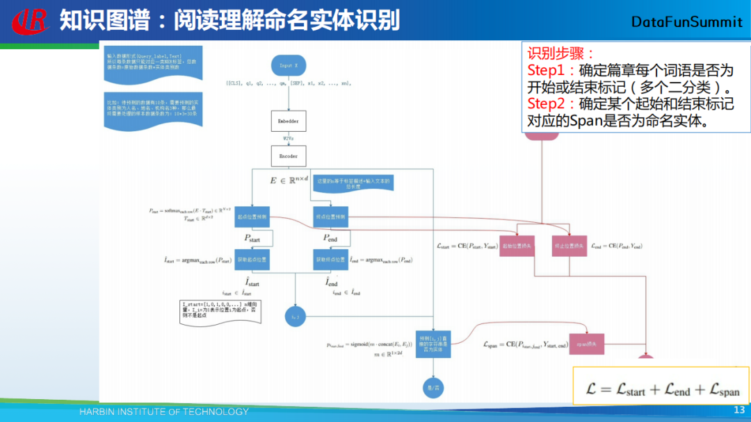 以上为该阅读理解方法的整体框架,这里我主要给大家说明该框架的主要思想,当我们提出一个问题后,应该如何获得对应的答案呢,可以采用以下步骤:首先确定篇章每个词语是否为开始或结束标记(多个二分类问题);然后确定某个起始和结束标记对应的候选实体(Span)是否为命名实体。因此,在模型中需设计三个损失函数(loss),对应图中的三个粉红色矩形。第一个loss代表答案开始位置的损失,第二个loss代表答案终止位置的损失,第三个loss代表这个答案是否是一个正确答案。