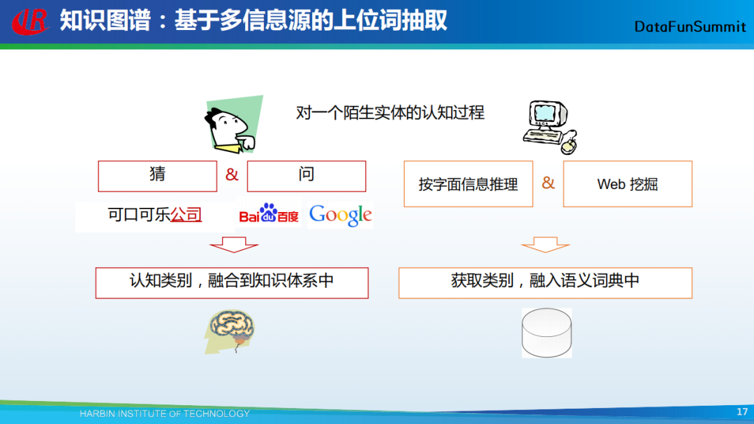 我在这里介绍一种基于多信息源的实体类型(上位词)抽取方法。模拟一个人对一个陌生实体的认知过程:首先将该实体输入搜索引擎,发现与它共现的词语,这个共现的词语很可能代表实体的类别;第二种方法是通过词典去查这个实体的类型;第三种方法是通过核心词来识别。例如,对于“可口可乐公司”这个实体词,它的核心词是“公司”,故我们可通过该核心词,识别“可口可乐公司”这个实体词的类型是“公司”。