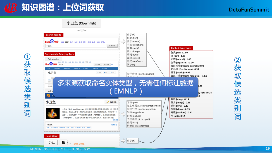 以上通过一个例子展示了通过上述方法得到的实验结果。以“小丑鱼”为例,可以从多个数据源中得到它的类别标签,然后通过启发式的规则对这些标签进行排序。最终可以看到,排在前面的标签即为小丑鱼的真正上位词。这种方法的好处是:可以从多数据源中获取命名实体的类别标签而无需任何标注数据。