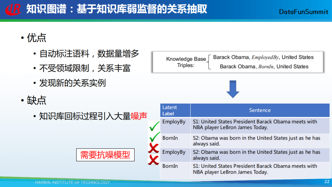 在知识图谱中,实体关系的类型非常丰富。基于弱监督的方案是关系抽取中一类重要的方法,该方法首先从知识库中抽取一系列的三元组,然后利用它们去回标文本,这样就可以得到大量不受领域限制的训练数据。总的来说,这种回标方法的好处主要有:自动标注语料,数据量多;不受领域限制,关系丰富;可以发现新的关系实例。同时缺点也很明显,即回标过程会引入大量噪声。如在上图示例中,表格中的前两个回标结果是正确的,后两个回标结果就是错误的。所以,我们需要抗噪模型。