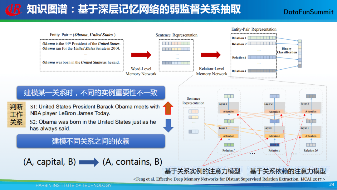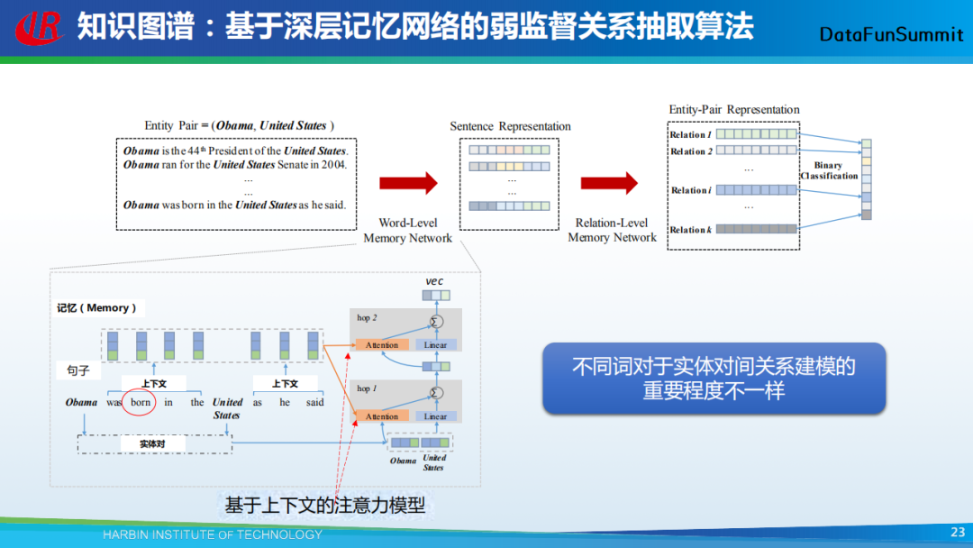 这里我们介绍一个自己的工作,即一种基于深层记忆网络的弱监督关系抽取算法。该方法包括两个层次,第一层为单词级别的记忆网络(word-level memory network),用于将一个句子编码为一个向量;第二层为关系级别的记忆网络(relation-level memory network),用于给句子进行分类,即判断该句子是否包含了指定类型的关系。在单词级别的记忆网络中,我们发现不同的词对于实体对间关系建模的重要程度不一样。例如,在描述出生关系时,born这个单词就很重要。因此,我们引入注意力机制来刻画上下文中不同单词对于挖掘目标实体对间关系的重要程度。