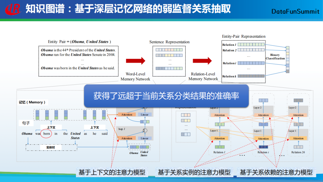 将以上提到的单词级别的记忆网络(word-level memory network)与关系级别的记忆网络(relation-levelmemory network)结合在一起,就形成了基于深层记忆网络的弱监督关系抽取模型。实验结果表明,该模型获得了远超于当前分类结果的准确率(关于实验的细节部分,我在这里就不再赘述)。