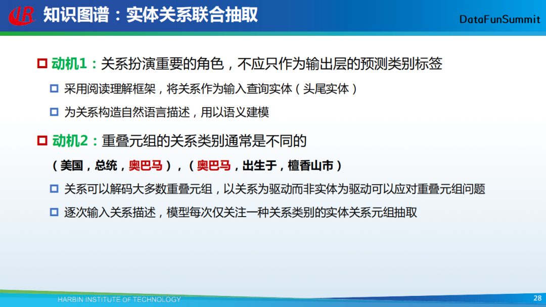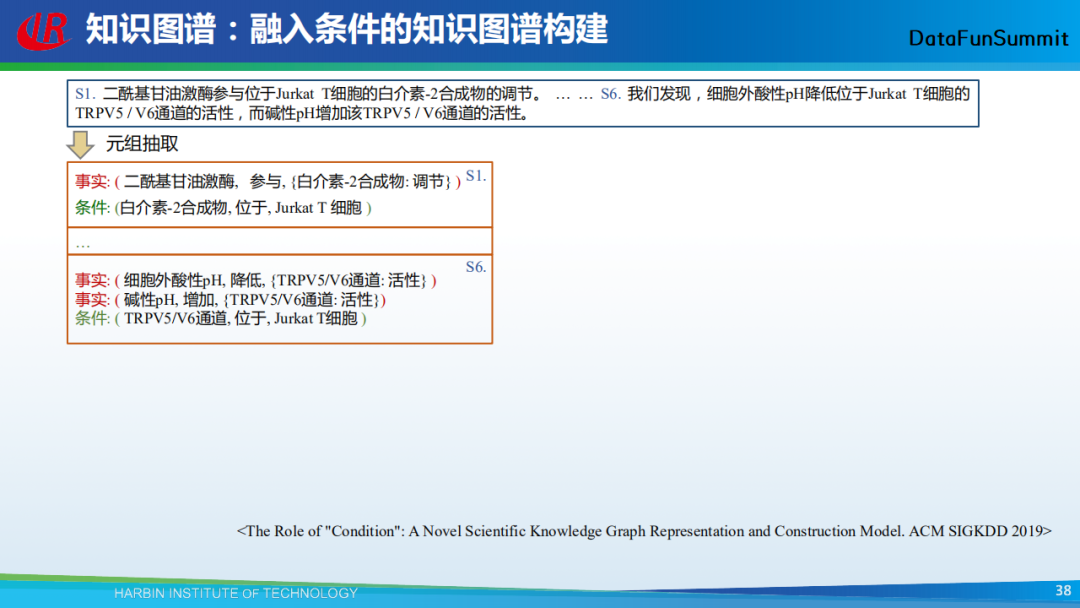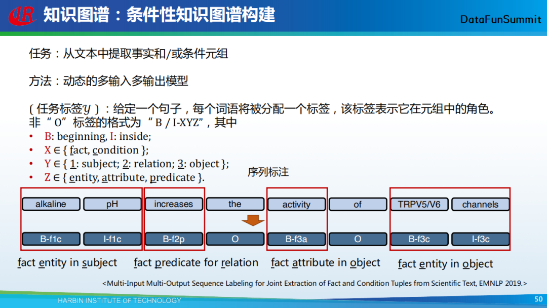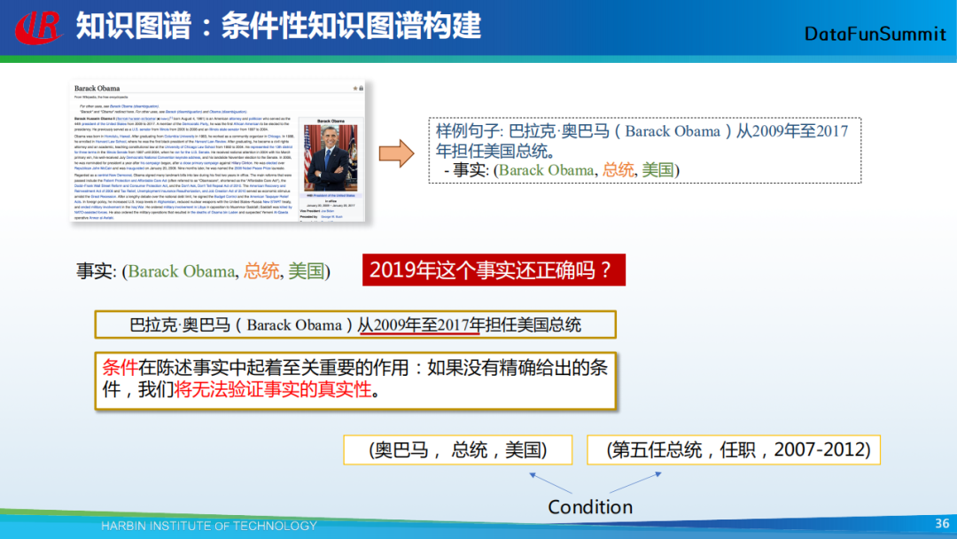 以上给大家了分享了我们在知识图谱构建中所采用的一些主流方法。接下来,我还想用几页PPT给大家分享我们现在正在做的另外一项工作——条件性知识图谱。在做知识图谱时,我们主要是从文本中来抽取一系列的三元组,它们也被称为事实知识。然而这些事实知识并不总是成立,例如在上图中,我们从文本中抽取得到(奥巴马,总统,美国),但是这个事实目前是不成立的。据此,我们希望抽取到的三元组能够包含两种知识,一种是事实知识,一种是条件知识(通过条件来限定事实知识)。在以上图例中,对应的条件知识即为(第五任总统,任职,2007-2012)。
