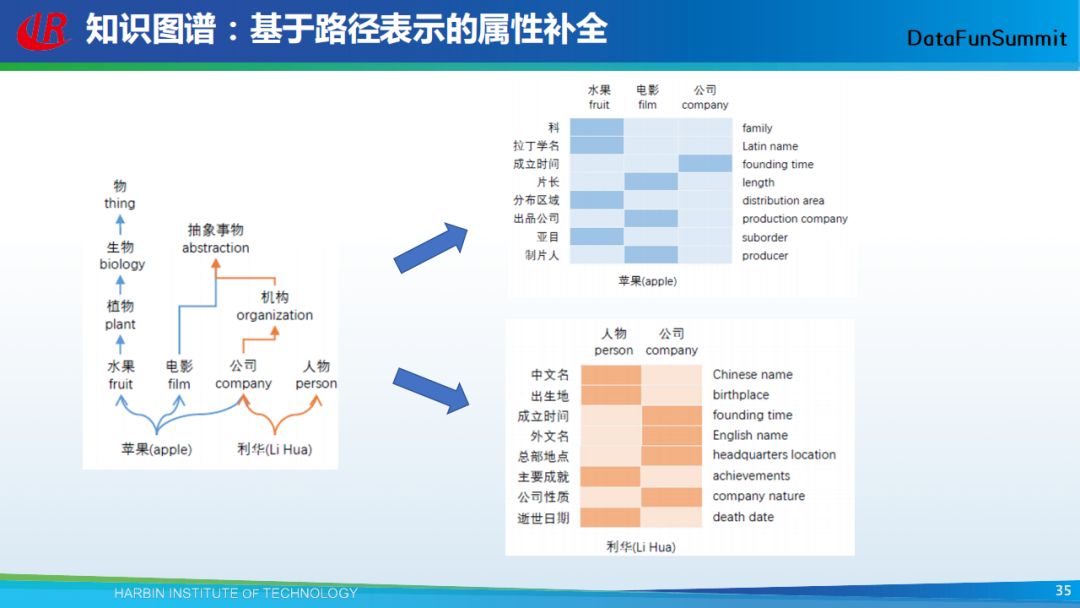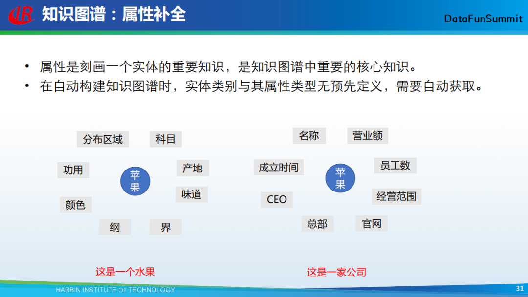 属性是刻画一个实体的重要知识。如上图中的示例(左),通过苹果的属性(如科目、产地、味道等),我们知道这里的苹果是一种水果;在示例(右)中,通过苹果的属性(如名称、成立时间、CEO等),我们知道这里的苹果是一家公司。在自动构建知识图谱时,实体类别与其属性类型无预先定义,需要自动获取。