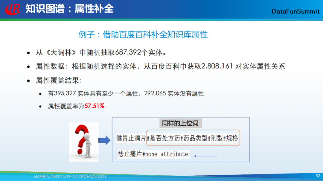 那么,我们如何来挖掘实体的属性呢?其中一种方案是,我们可以借助已有的词典来帮助我们获得实体的属性。如上图为例,我们的做法是,从知识图谱《大词林》(《大词林》是由我们中心构建的国内规模最大的开放域知识图谱,其中包含了实体、关系以及概念)中随机抽取了687,392个实体,然后在百度百科中进行搜索,我们希望将百科中实体的属性补充到《大词林》相应的实体上去。然而,我们发现:针对《大词林》中的实体,在百度百科中只有395,327个实体具有至少一个属性,292,065个实体没有属性(即属性的覆盖率为57.51%)。产生这一问题的原因其实也很简单,即不同知识图谱中的实体可能是有交叉的,并不一定能完全覆盖。