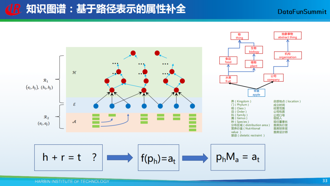 以上为上述方法的示意图。左边部分,底下的绿色矩形代表实体的属性,中间蓝色的圆圈代表实体,它们上面的红色圆圈代表实体的概念,概念之间也具有上下位关系。我们考虑通过TransE的方式(h+r=t)为实体推荐属性,h代表概念路径,r代表实体,t代表属性。然而,在很多情况下,实体是否具有属性与其本身无关,而只与该实体之上的概念有关。例如,苹果具有颜色的属性,这和苹果自身(的标签)无关,而和苹果是一个水果是有关系的。因此,我就将实体去掉了,转而判断概念与属性间的相互关系。