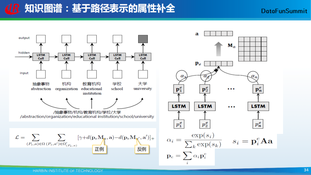 基于上述想法,我们提出了以上处理流程。通过LSTM,我们会为每个概念的路径生成相应的向量表示,我们发现在训练样本中,我们知道某个属性是属于某个实体的,但并不知道其属于这个实体的哪个概念,所有我们采用注意力机制(Attention)来为多条概念路径分配权重,最终形成实体的概念表示。最后通过打分函数完成实体的属性推荐任务。