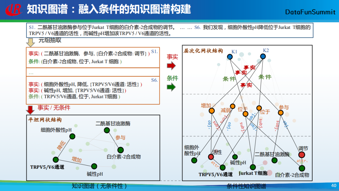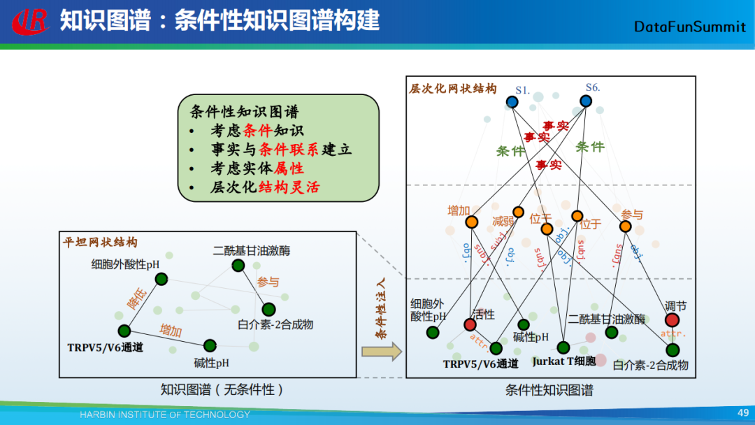 上图底部(左)是传统的知识图谱(无条件性),上图底部(右)是条件性知识图谱,它主要包括三层:最底下一层是实体属性层,表现了所有实体和属性的关联;中间是关系层,这里我们将关系也作为一个节点;最上面的是知识层,由条件和事实三元组构成,表明这些事实是在某些条件的约束下才成立。