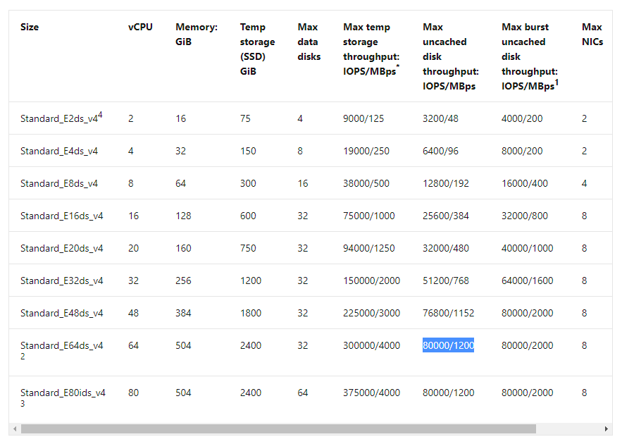 图自Azure官网:E64ds_v4 VM的IOPS和带宽上限
